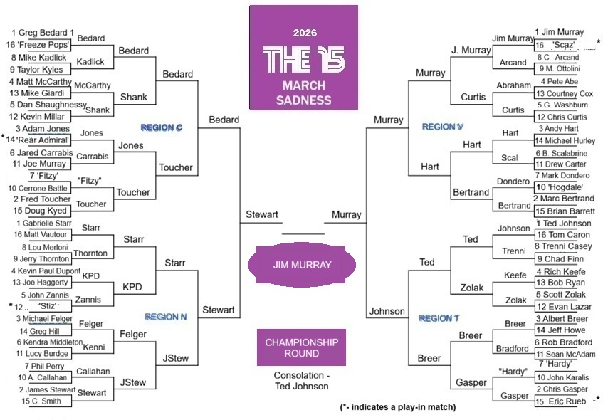 And so the Championship Round is set with the closest Four You Deplore vote margin in Tournament history, with a stunning rally from Team JStew to keep Greg Bedard from possibly repeating as champ, and a Ted Johnson comeback coming up one vote short against Large Gymnasium.